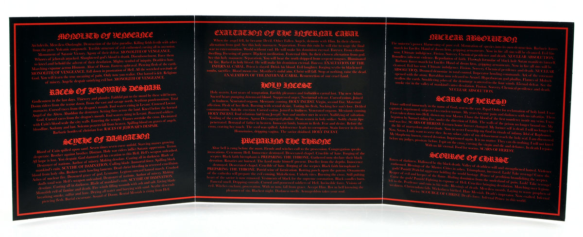 A statement from the band reads: "The Abomination is born once again. Hail AntiMother, from whose foul loins drips the pestilence of mankind's ruin. Come fiends and witches, Races of Jehovah's Despair. Witness the pomp and fanfare of the victory procession and lose your soul in the Exaltation. Another pact is made over desecrated graves and rusted steel."