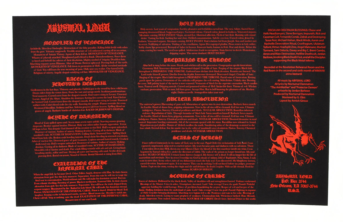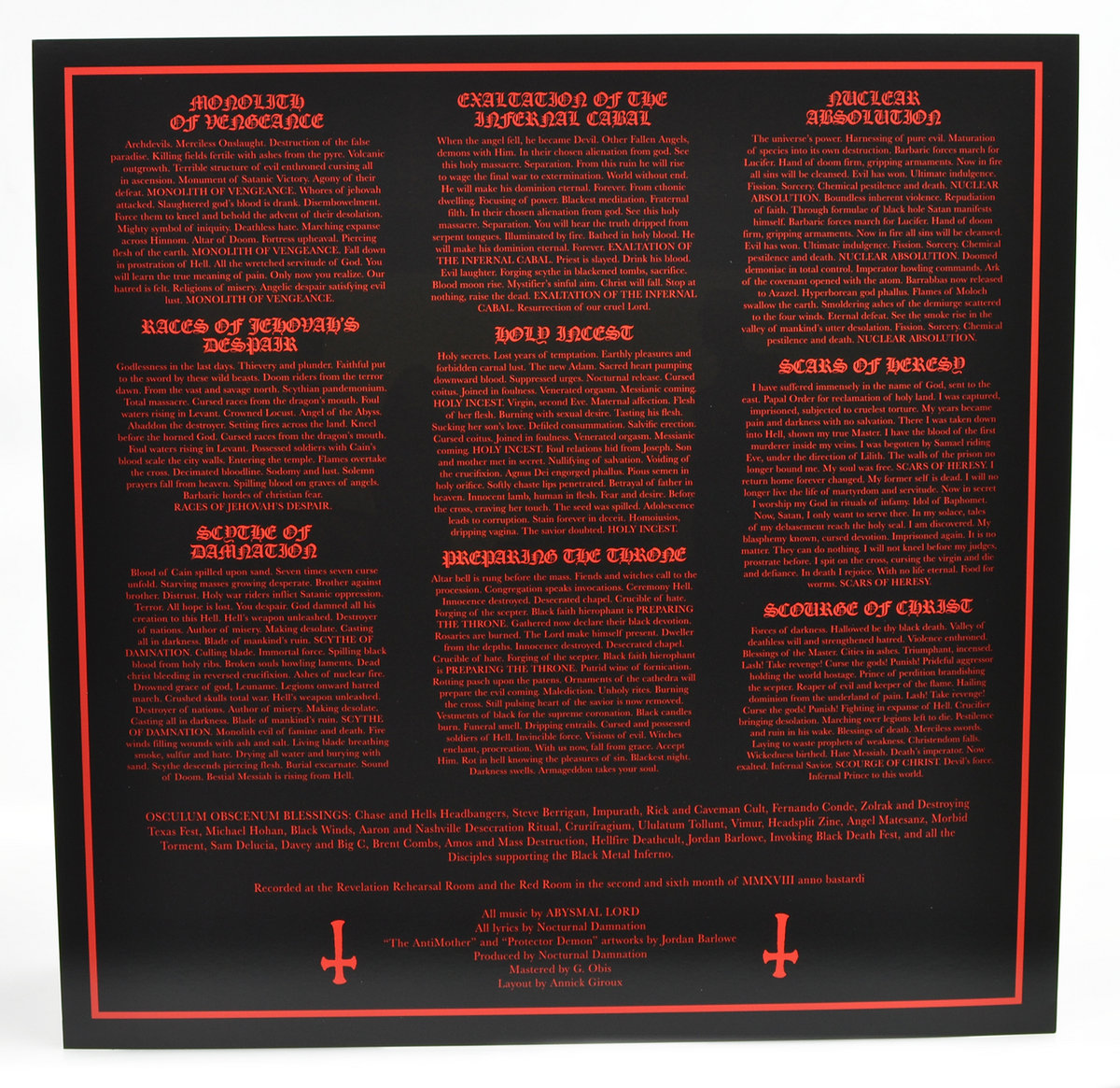 The throne is corrupt; there steps forward ABYSMAL LORD, to assume their rightful place. Behold their Exaltation of the Infernal Cabal and tremble before unspeakable doom.